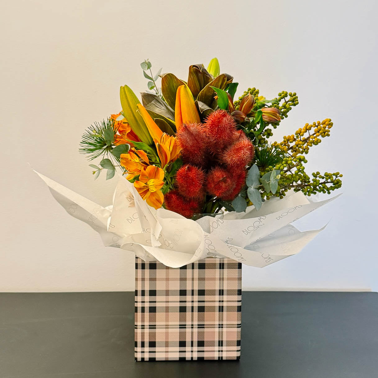 Um mix vibrante com lírios, astromélias, urucum seco, pinóquio e folhagens tropicais — no clássico vaso cilíndrico de vidro.