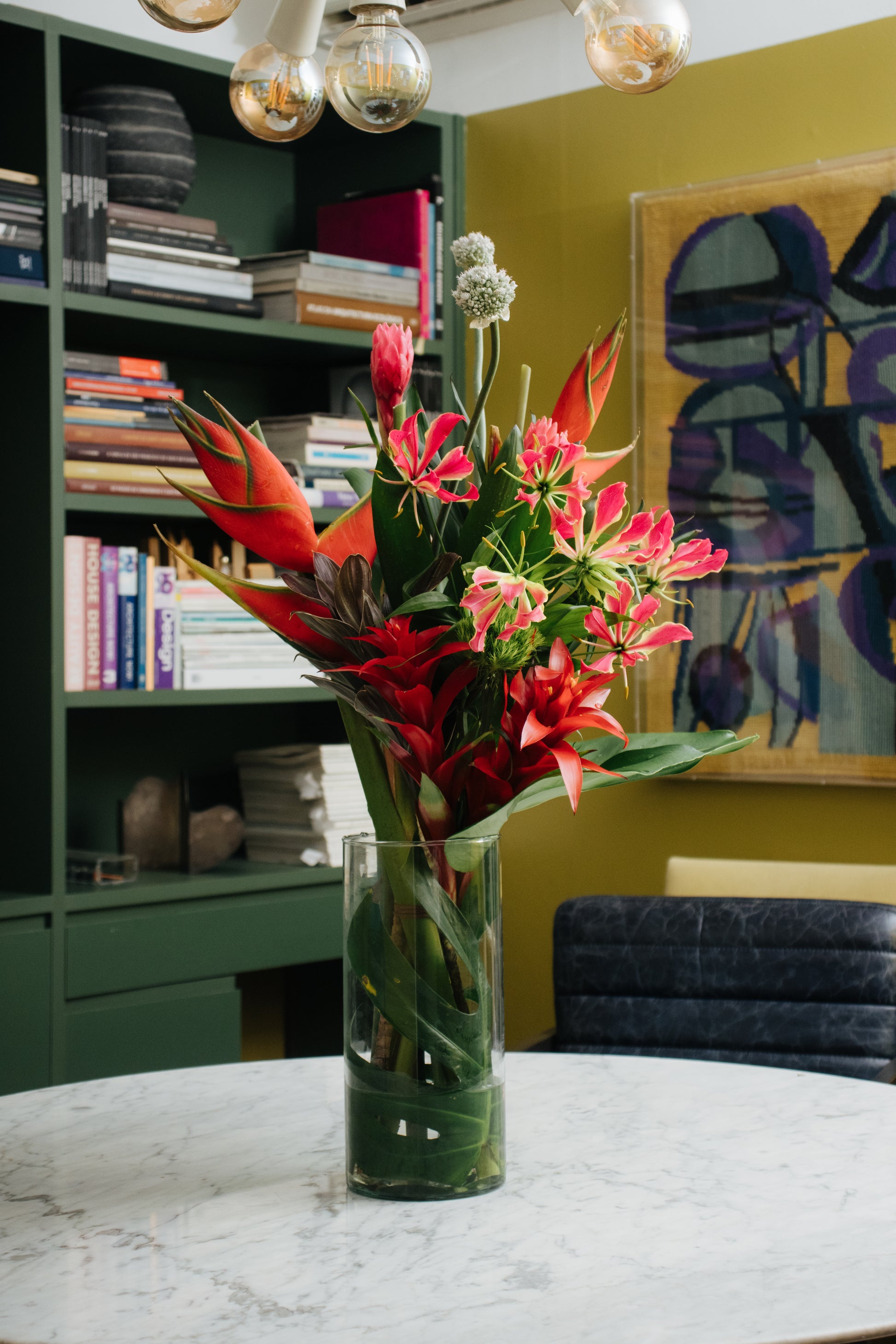 Composição com mix de flores tropicais, folhagens especiais e sementes.