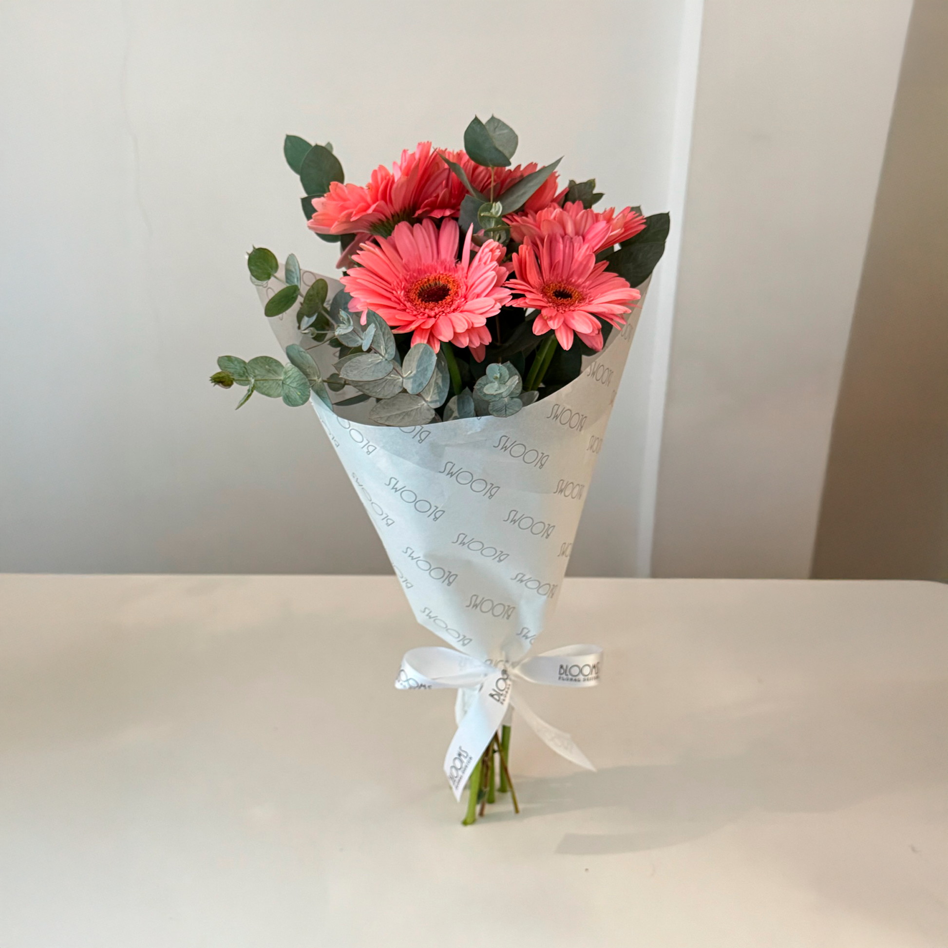 Gérberas coral e folhagem de eucalipto, envolto em papel personalizado Blooms com laço de cetim branco.